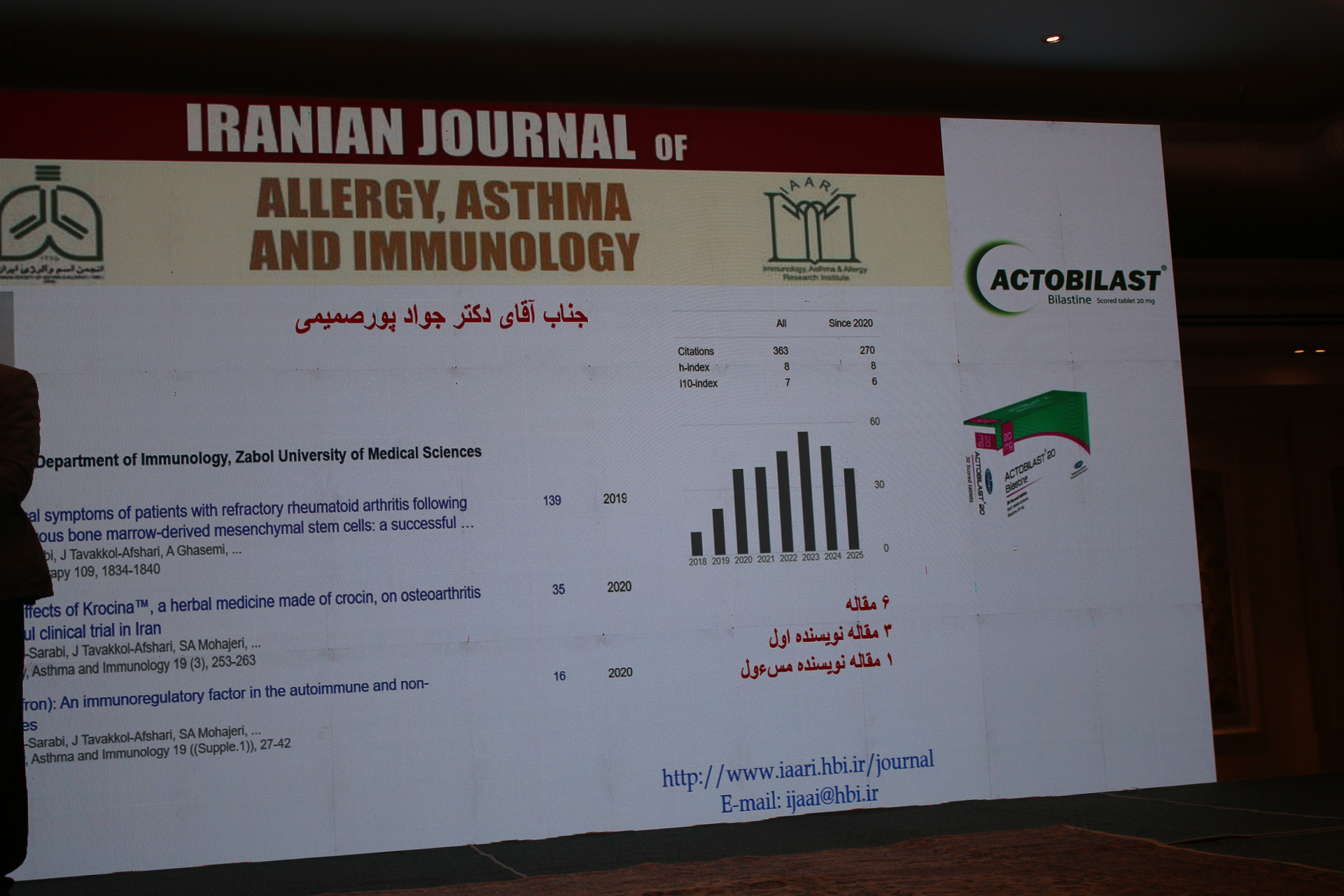 مراسم تقدیر از داوران و نویسندگان برتر  این مجله با هدف پاسداشت تلاش‌های علمی پژوهشگران و افزایش کیفیت مقالات منتشر شده در IJAAIروز پنجشنبه ۳ مهر ۱۴۰۴ در سالن پارسه هتل اسپیناس با حضور دکتر مصطفی معین (مدیرمسئول مجله)، دکتر  مسعود موحدی، سردبیر مجله، دکتر علی اکبر پورفتح اله، دبیر مجله، دکتر محمدرضا فضل الهی، معاون مرکز تحقیقات ایمونولوژی، آسم و آلرژی و محمدحسن بمانیان، دبیر انجمن آسم و آلرژی  ایران و دیگر دست اندرکاران مجله و جمعی از استادان حوزه ایمونولوژی، آسم و آلرژی برگزار شد.
